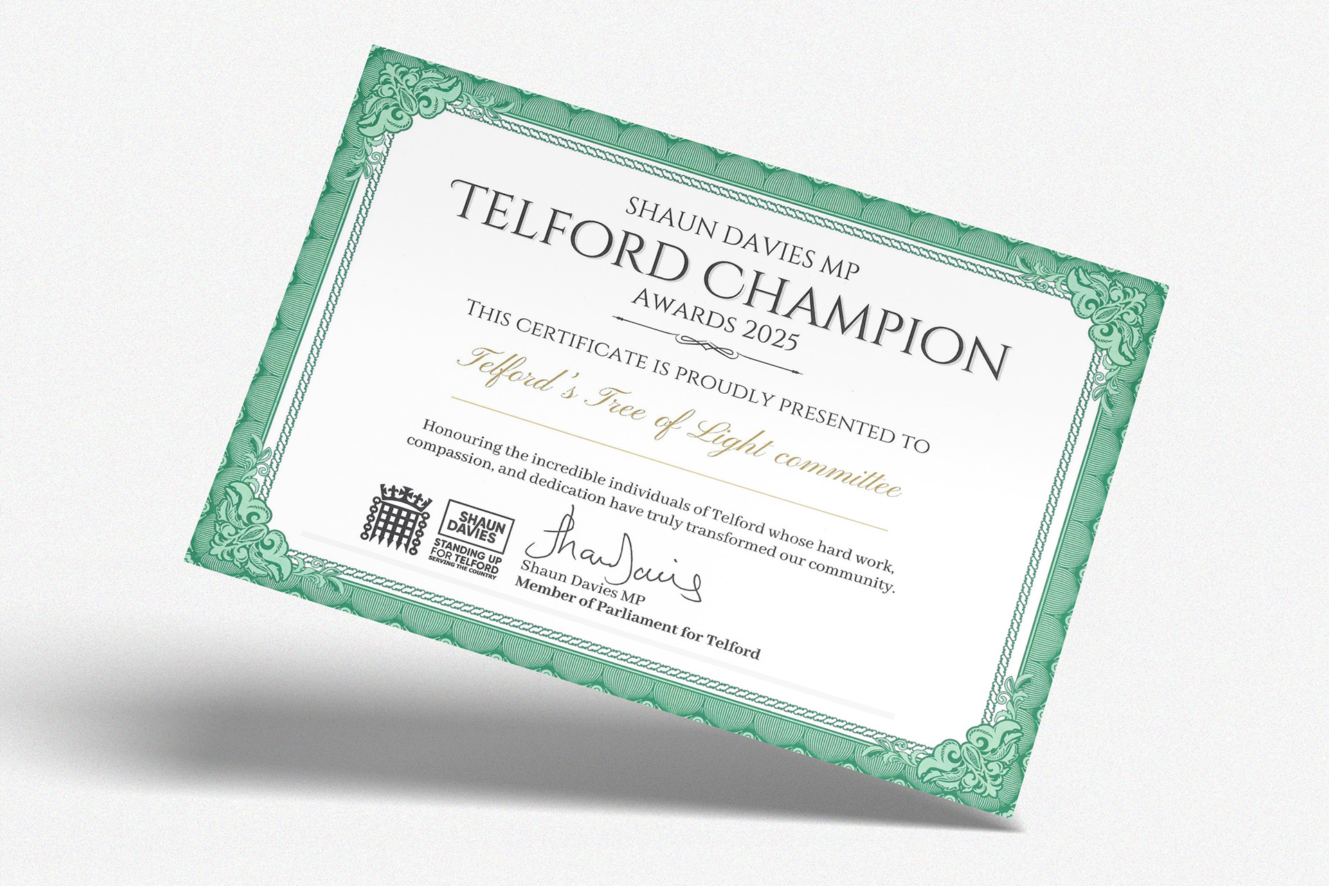 We were delighted to meet with Shaun Davies MP in May and be presented with a Shaun Davies MP Telford Champion 2025 Award in recognition of the contribution the Tree of Light makes to the community. Shaun has been a fantastic supporter of our charity and continues to be a great advocate of what we do. Thank you Shaun!!